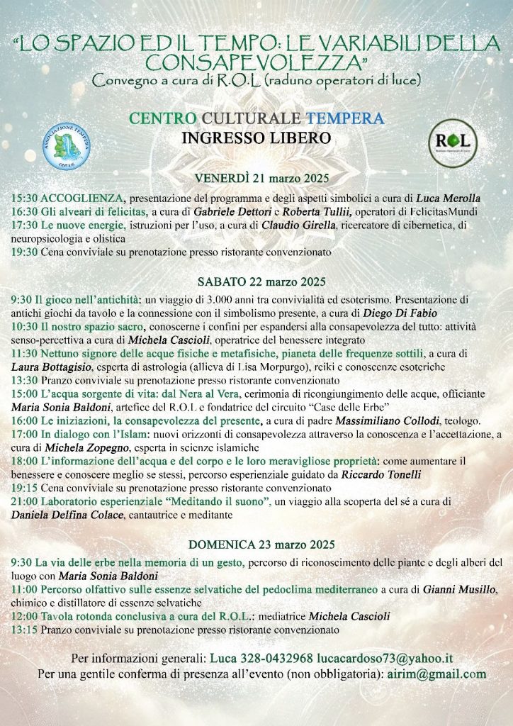 In occasione dell’equinozio di primavera siete invitati al CONVEGNO su tematiche di confine “LO SPAZIO ED IL TEMPO: LE VARIABILI DELLA CONSAPEVOLEZZA” a cura del R.O.L. (raduno operatori di luce).